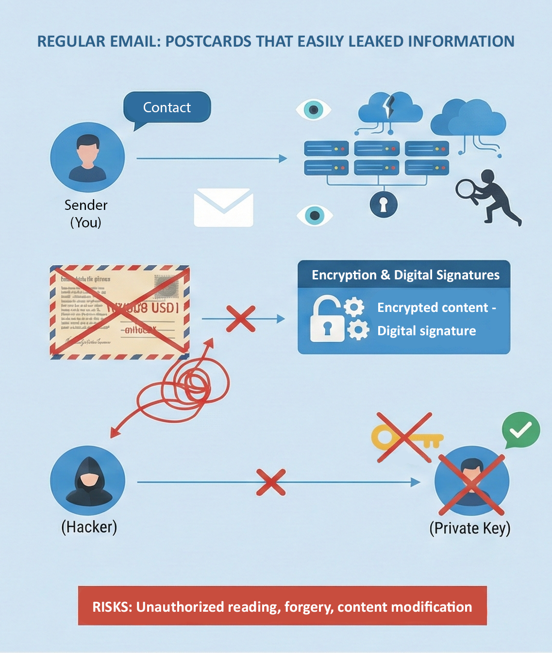 - Identity authentication (Digital Signature): Helps the recipient accurately identify the sender of the email, equivalent to stamping an official seal on a paper document.